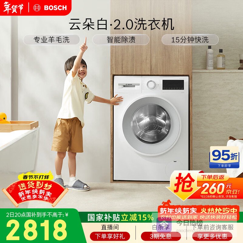 【京东自营】博世云朵白2.0大容量变频强力去渍除菌除螨洗衣机WGA152000W¥