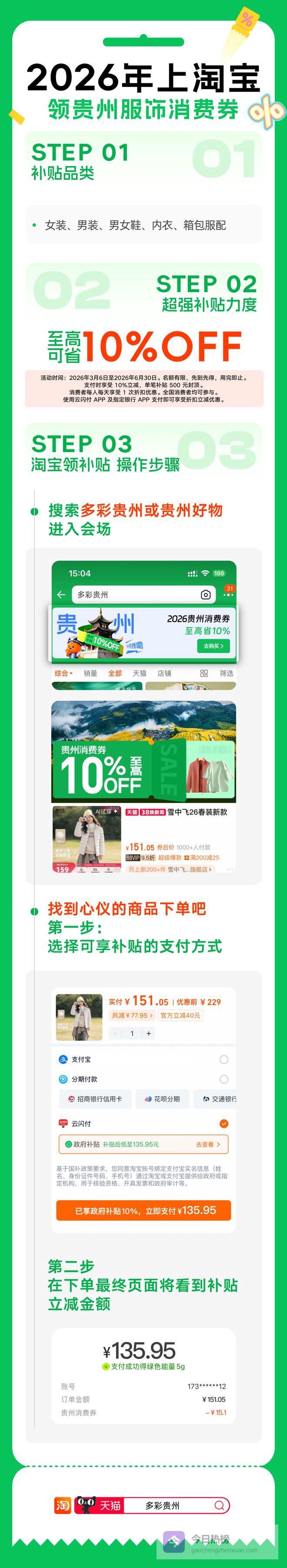 活动期间,省内外消费者在淘宝平台搜索“多彩贵州”或“贵州好物”,即可进入“2026年贵州省线上服饰商品促销专区”选购商品,提交订单支付时使用云闪付APP或银行APP支付可享受政府补贴9折优惠,即支付时享受10%立减,单笔补贴500元封顶。消费者每人每天享受1次折扣优惠,订单取消发生全额退款时,退回资金可继续使用。