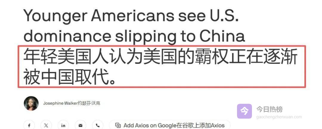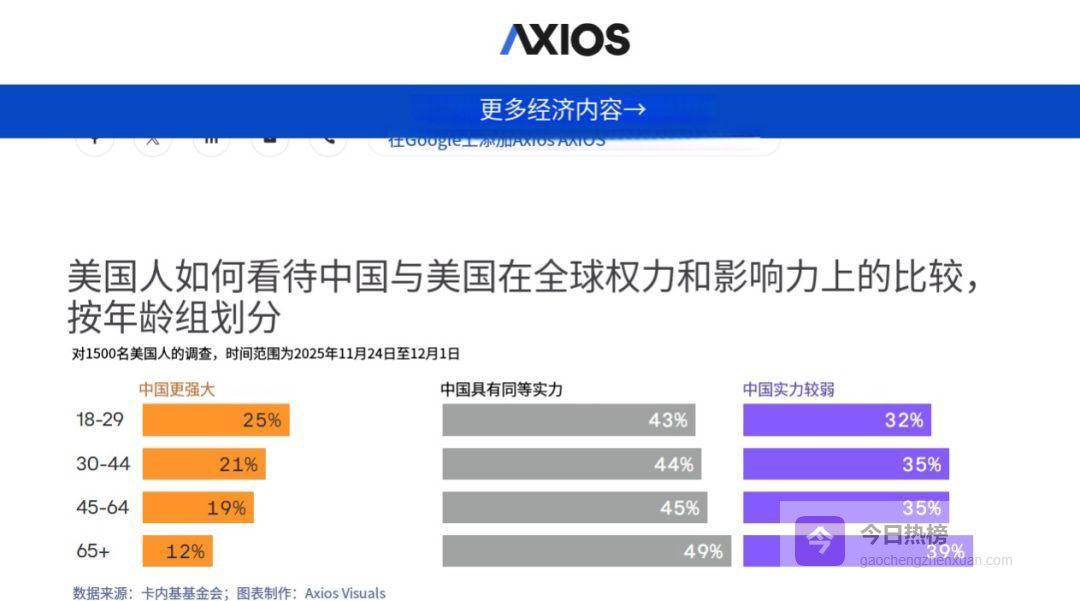卡内基国际和平基金会最近搞了一项调查,结果让人不得不重新审视美国社会内部的认知裂变——68%的18到29岁年轻人认为,中国的综合影响力已经和美国平起平坐,甚至更强。