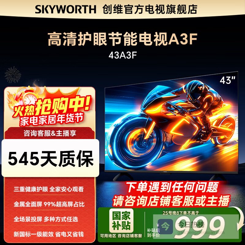 要我说,选创维全面屏电视,首先还是得看尺寸。如果你家客厅比较大,那65寸的创维65A5F绝对能满足你,这款电视的Mini LED背光技术带来的画质提升非常明显,色彩鲜艳,对比度高,再加上低反防眩光屏幕,白天看电视也不会反光,简直不要太爽。要是你家客厅小一点,或者想放卧室里,43寸的创维43A3F或者创维43M3就很合适,这两款都主打护眼,特别是无频闪和防蓝光功能,长时间看电视也不容易眼睛疼,对上班族和学生党来说,简直是福音。