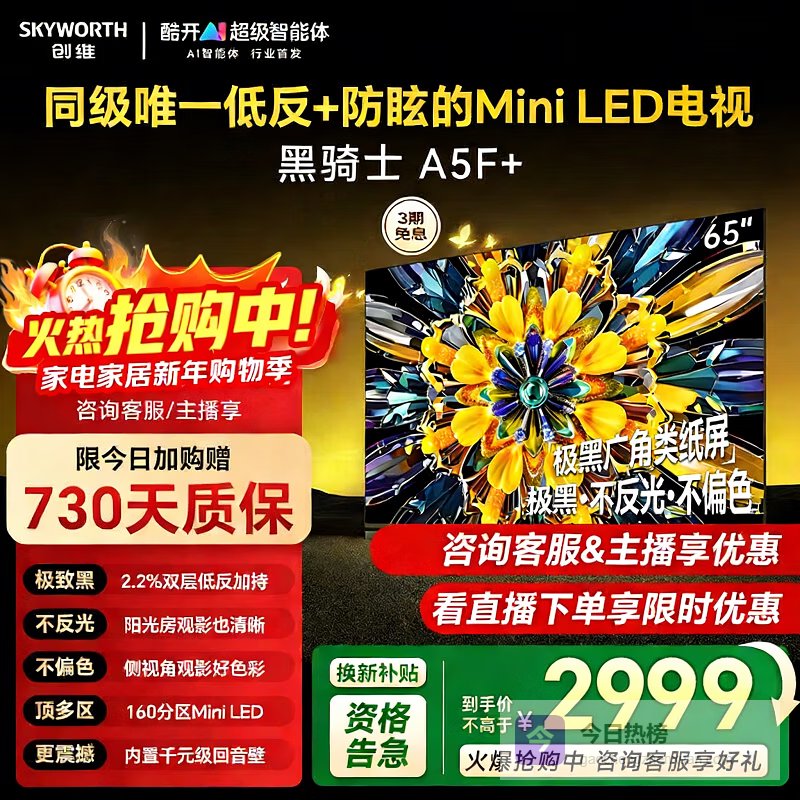 创维电视黑骑士65A5F+ 65英寸百级分区Mini LED 4+64GB一级能效低反防眩全面屏平板电视机 65英寸 咨询客服享好礼¥