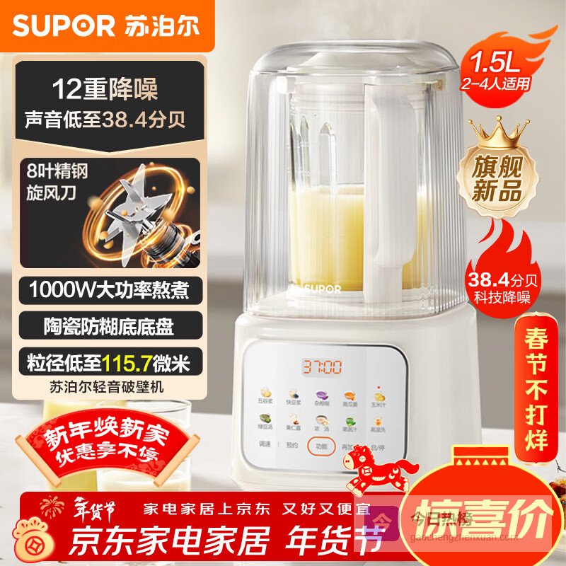 【京东自营】苏泊尔轻音破壁机1.5L低音有罩降噪家用豆浆机预约加热免滤全自动辅食料理机破冰碎冰榨汁机¥