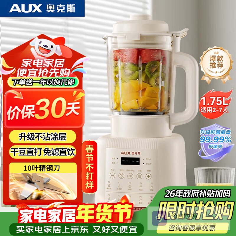 【京东自营】奥克斯破壁机家用多功能1.75L大容量轻音豆浆机榨汁机小型全自动免煮五谷杂粮料理机智能自¥