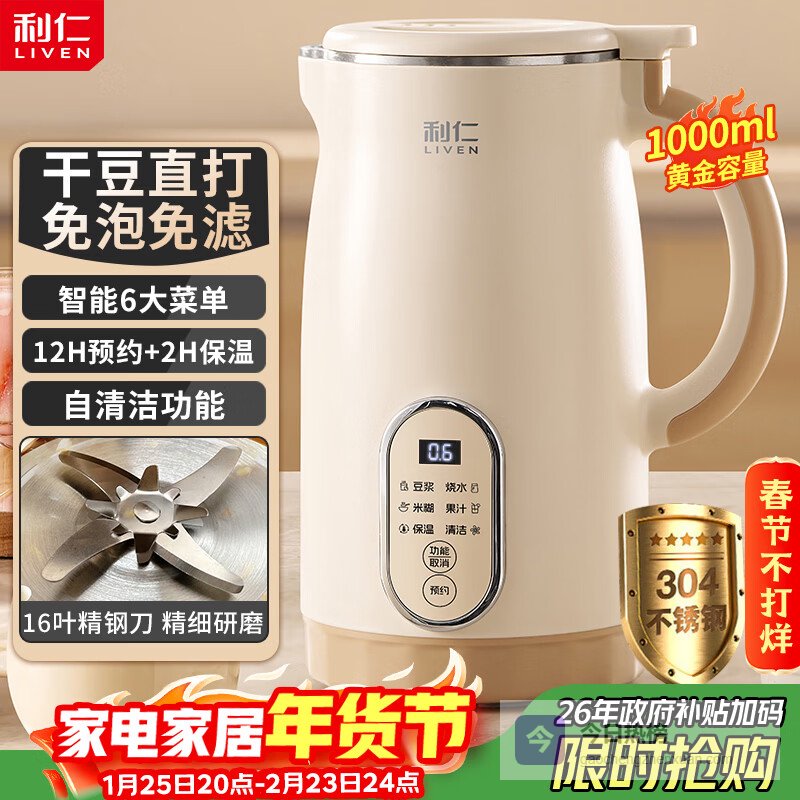 【京东自营】利仁豆浆机全自动免煮2025新款16叶刀头家用免过滤五谷杂粮家用米糊机破壁机小型料理机L¥