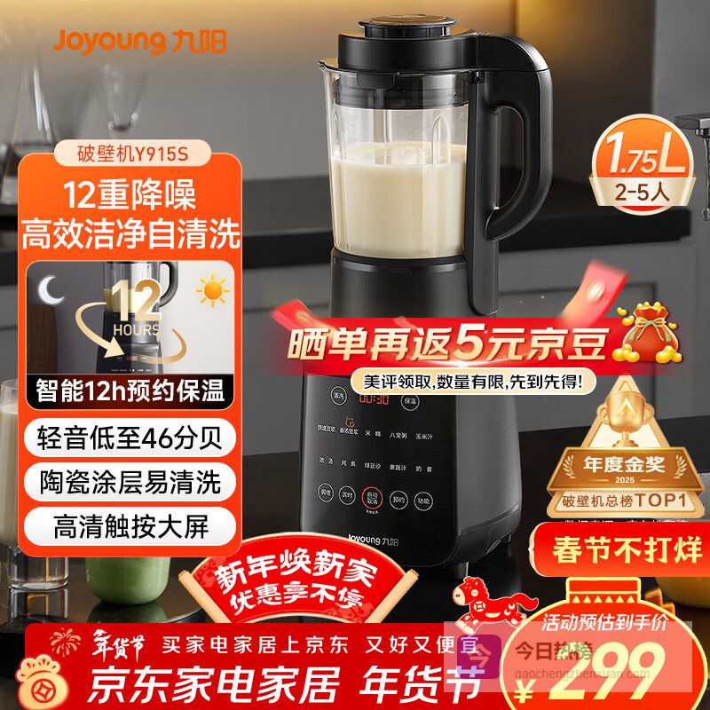 【京东自营】九阳破壁机家用轻音全自动多功能降噪预约豆浆机榨汁辅食机1.75L五谷杂粮3-5人金榜补贴¥