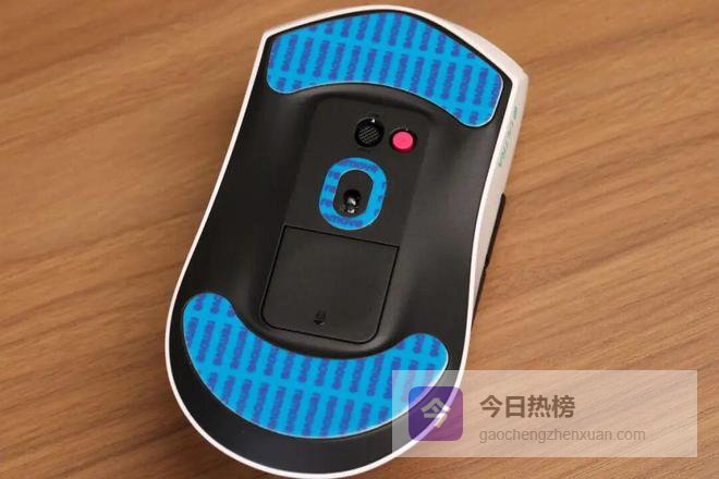 将鼠标翻转至底部,设计细节同样可圈可点——其前后各搭载两颗大尺寸“冰感”PTFE特氟龙脚贴,顺滑度拉满,移动时阻力极低,适配各类鼠标垫,耐磨耐用且操控丝滑。除脚贴与产品铭牌外,底部还集成模式切换按键、自定义DIY按键、nano USB收发器专属收纳槽,以及适配无线充电底座的接口与凹槽,功能布局规整合理,兼顾实用性与便捷性。