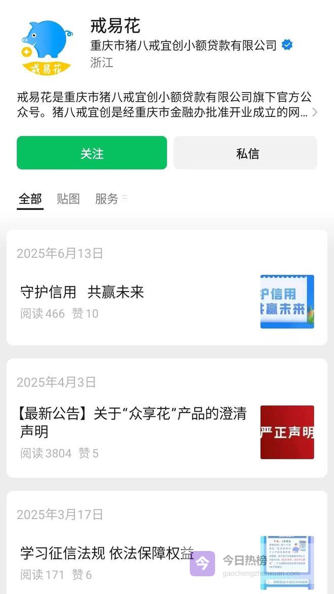 值得注意的是,近期有消费者反映,戒易花已关闭借款申请入口,仅保留还款通道,官方公众号长期停更。有消费者表示,自己在黑猫投诉平台投诉后,至今未得到平台任何有效回应;向重庆市金融办投诉后,也无果而终。