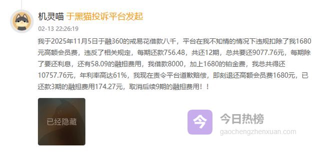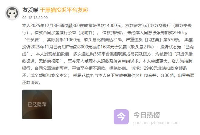 有消费者投诉称,借款8000元,资金到账后即被强制扣除1680元会员费,扣费比例达21%;另有消费者借款14000元,被扣2940元会员费,实际到手仅11060元,而平台仍按全额本金计算利息,进一步推高了借款成本。