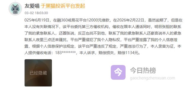 黑猫投诉平台上,有消费者反映,逾期后接到催收外包人员的威胁电话,对方声称要联系其紧急联系人,并要求一次性全额还款,即便消费者明确表示可正常沟通,催收人员仍持续骚扰。更有消费者表示,自己的个人信息被平台泄露,导致无关人员频繁致电,个人隐私安全无法得到保障。