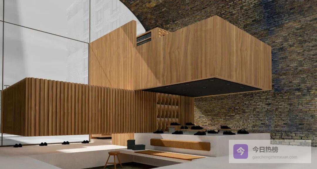 下图把鞋楦抽象成L形体块,堆叠出“连锁体积”,形成下沉试鞋区、员工区与精致木楼梯,空间因此有了节奏与呼吸。