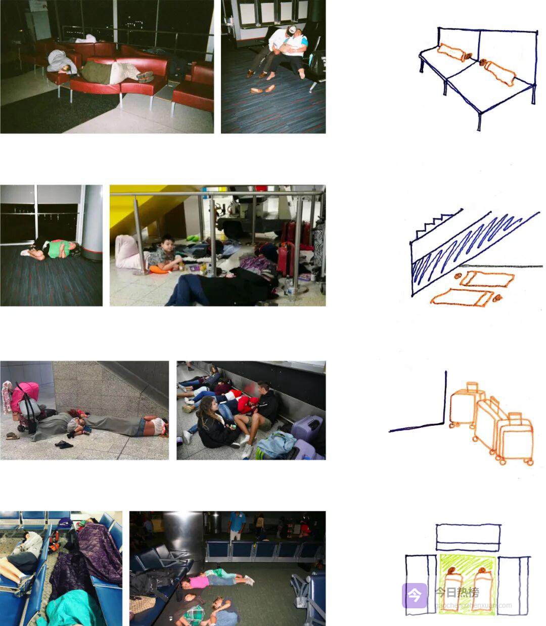 为机场露宿者设计的“Sleeping in the Airport”把机场、街头、地震避难所三种场景拆成围合形式、材料清单与睡眠行为数据,让细节自带真实温度。