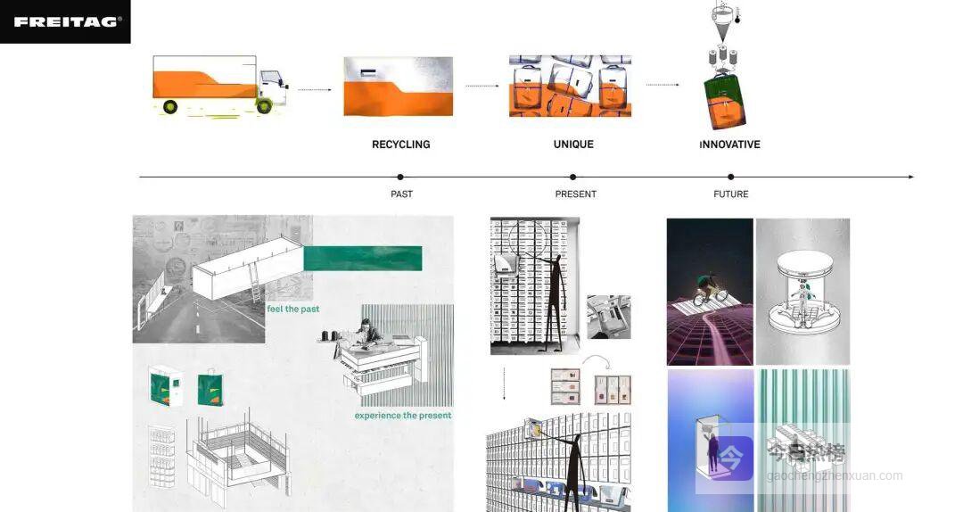 FREITAG零售店先拆解包袋制作流程,提炼出“工业感+未来感”两大主题,再用回收卡车蓬布油布做皮肤,把品牌故事写进每一道缝线。