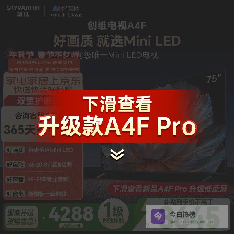 创维电视A4F 75英寸 百级分区Mini LED 144Hz高刷 HI-FI音响 一级能效 国家补贴¥