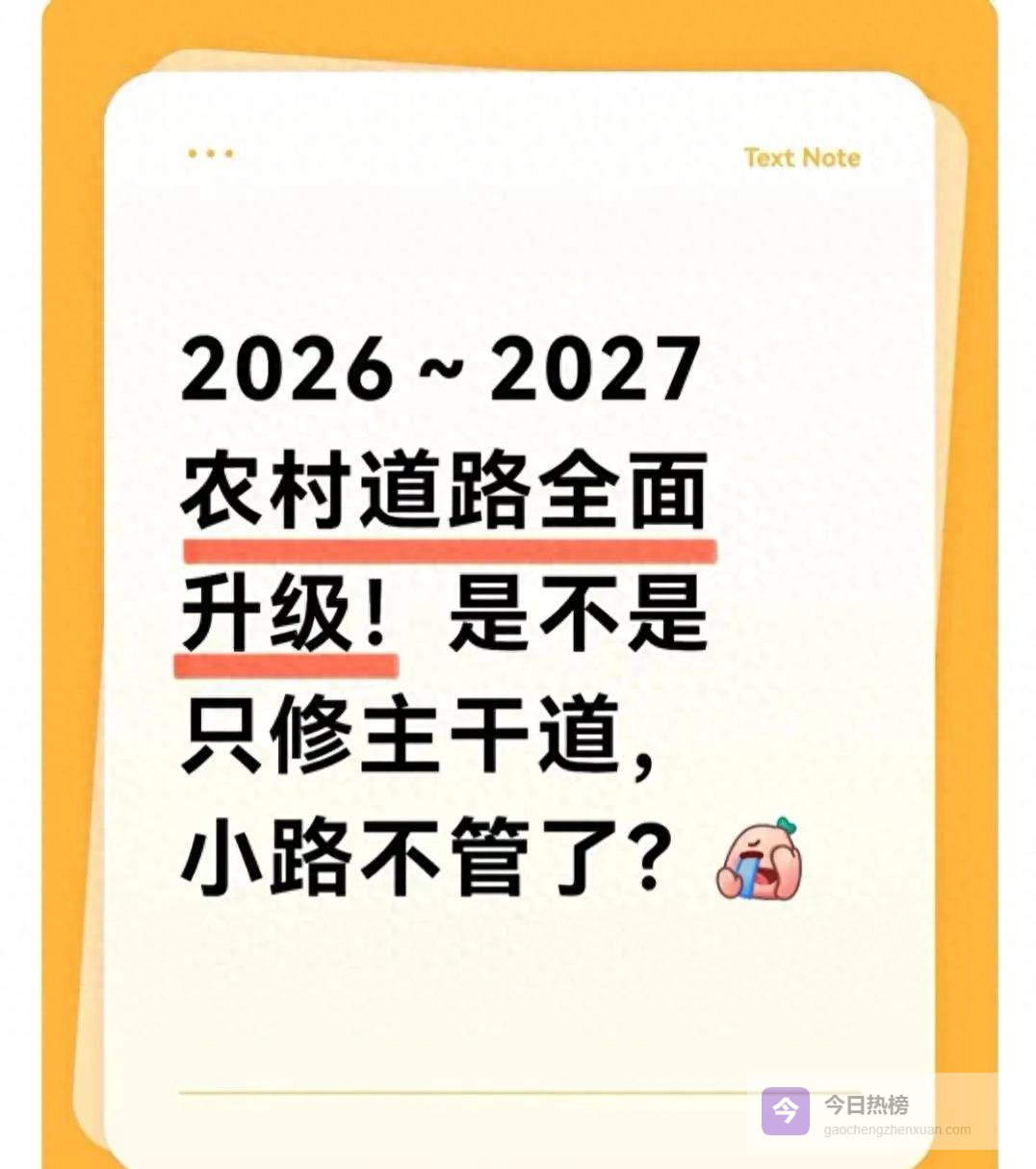农村道路全面升级,本质是为了让农村更宜居、让农民更幸福。它不仅是修几条路,更是打通城乡融合的“血脉”,让农产品运得出、城里人进得来,让乡村振兴的步伐更稳、更快。家门口的路修好了,孩子上学更安全,老人看病更方便,农产品卖得更远,生活品质随之提升。从2026到2027年,让我们一起期待一条条平坦的小路连接千家万户,也连接起乡村振兴的美好未来。