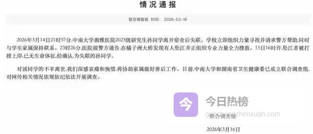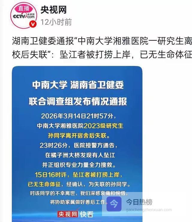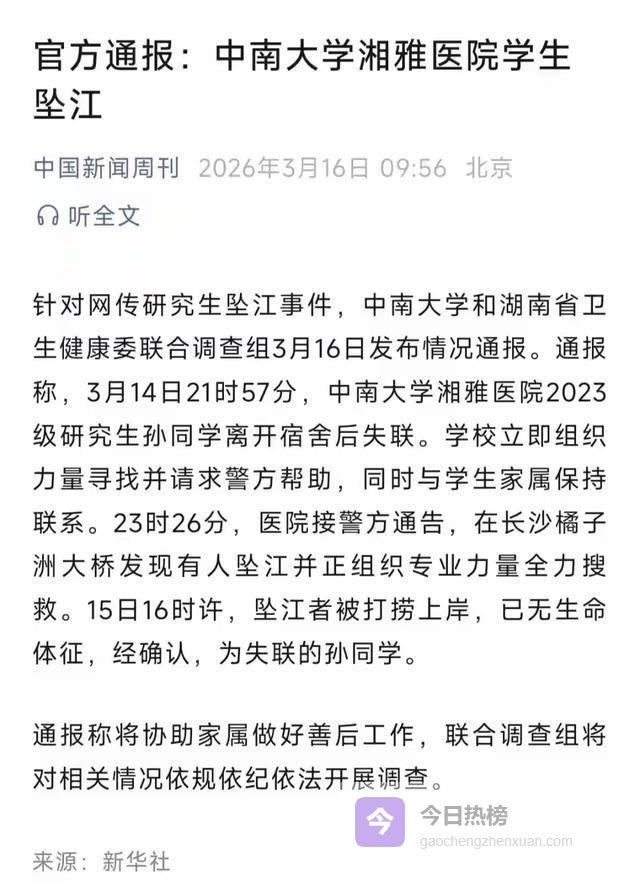 中南大学研究生孙同学坠江,生前发文剑指坠江原因,三日时间事件在网上逐渐发酵,于3月16日有了最新的官方通报,目前中南大学和湖南卫健委成立联合调查组,对事情的真相进行调查。
