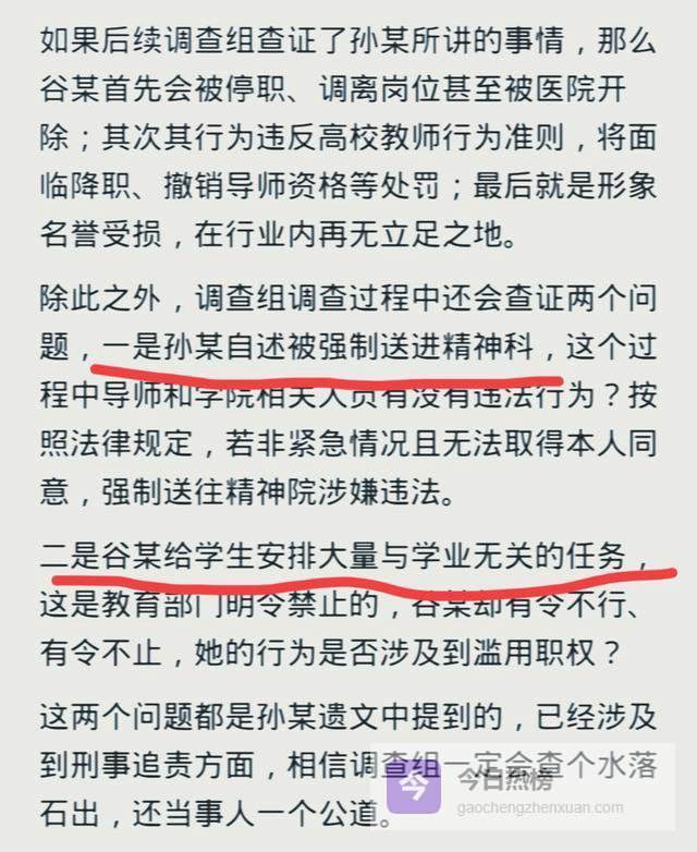 在孙同学留下的遗言当中所包含的主要涵盖两个方面,一个是强制送孙同学进精神科是否属实、是否涉嫌违法,其次就是滥用职权,压榨学生为廉价劳动力。
