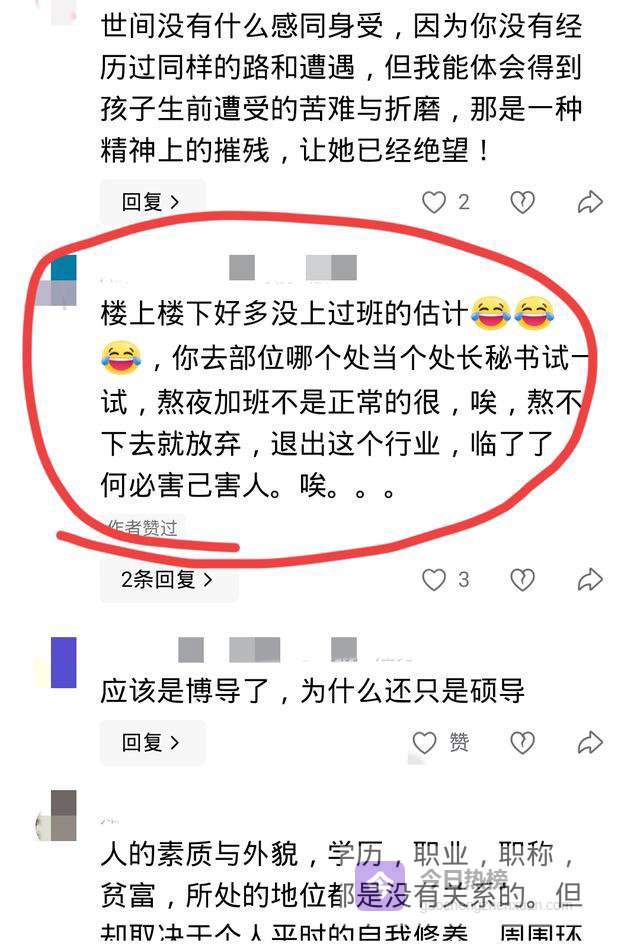 在评论区也出现了不同的声音,表示孙同学是家里太溺爱了、娇生惯养的,熬夜加班很正常,熬不了就放弃,临了了还害人害己。