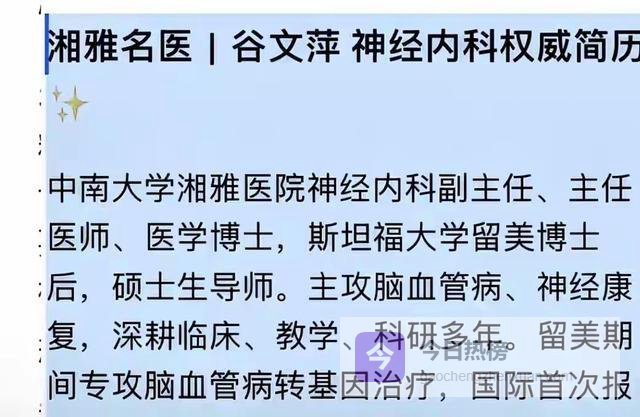 引言对于谷某某停诊的原因,红星新闻记者也在17日傍晚致电中南大学湘雅医院院长雷光华,雷院长回应红星新闻称:“谷医生并没有被停职,只是因本人受到很多来自社会的骚扰,所以暂无法开展工作。”