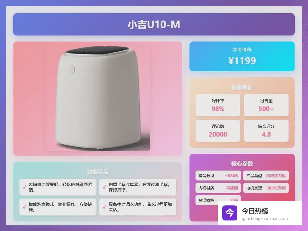 七、小吉紧凑多功能:这款小吉U10-M洗衣机体积很小巧,约A4纸大小,宽度50cm以下、深度50.1cm以下,放在出租屋或小户型里完全没问题。全自动操作,一键启动,操作简单省事,非常适合单身或空间有限的地方使用。即使容量只有5kg及以下,但日常洗一些内衣、内裤、运动服还算够用,省得占空间还挺实用。