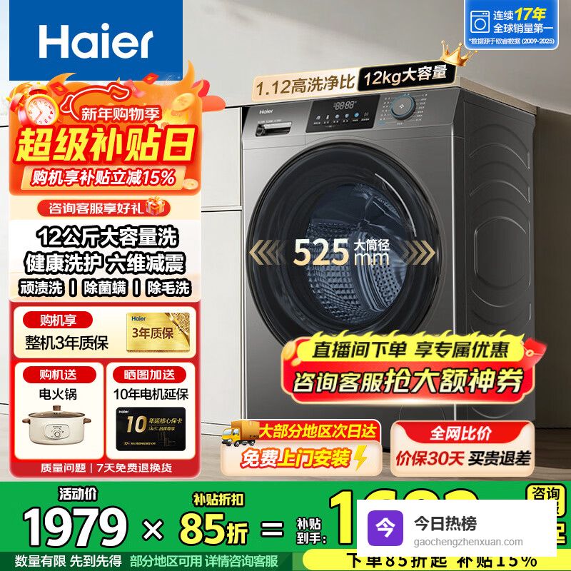 三、海尔大容量洗涤:这款海尔12公斤滚筒洗衣机,一次可以洗很多衣服,一周的衣物差不多都能一次搞定,非常适合大家庭使用,不用反复洗,省时又省力。