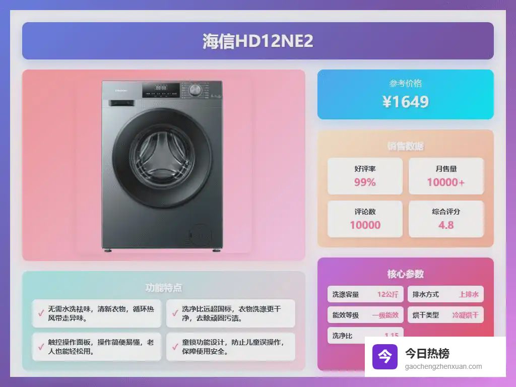 四、海信大容量洗涤:这款海信HD12NE2可以一次洗12公斤衣服,特别适合大家庭或者经常洗大量衣物的情况。用起来还挺方便的,省得每次分批洗,想洗多少都能搞定,特别节省时间。