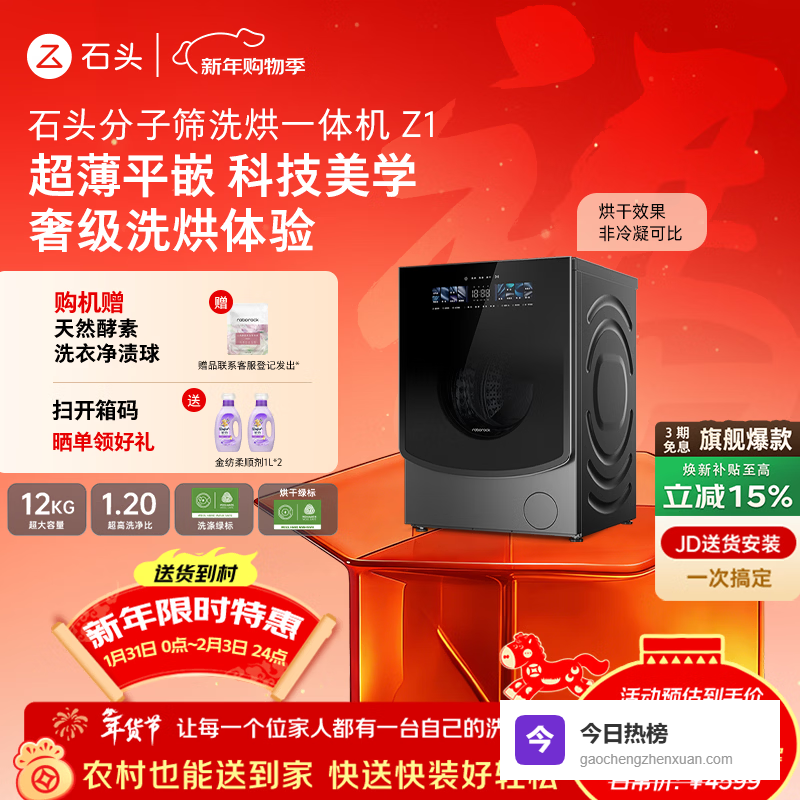 石头分子筛洗烘一体机Z1 全自动滚筒烘干洗衣机 12KG超薄大容量 1.2洗净比 国家补贴XQGH120RR21¥