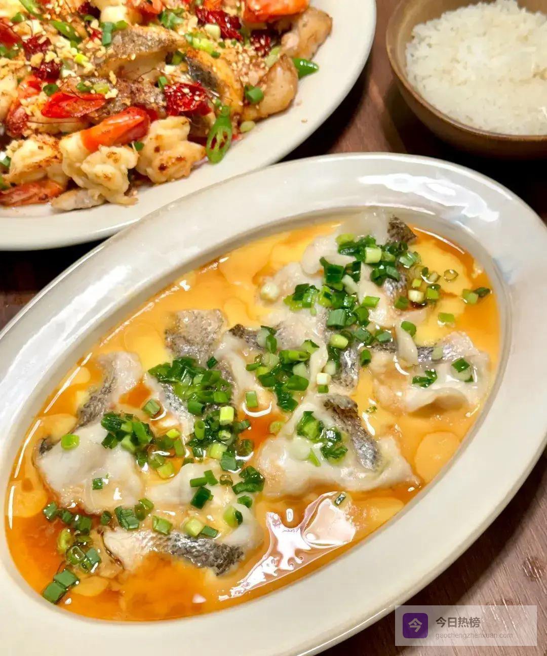 如果说排骨是敦实的底气,那鲈鱼蒸蛋就是春天献给味蕾的一首轻盈小诗。三个鸡蛋,加1.8倍的温水,一点点盐,打散后过筛两遍。这步骤不能省,滤掉气泡和未散的蛋清,蒸出来的蛋羹才能嫩如凝脂,平滑如镜。鲈鱼片用盐、糖、淀粉轻轻按摩入味,再淋上一点用热油激香的葱油。大部分蛋液先入碗,水开后转小火,锅盖记得留一条缝——这是蛋羹滑嫩不起蜂窝的秘诀。八分钟后,蛋羹已微微凝固,像初春的湖面。这时,将鱼片轻轻摆上,倒入剩下的蛋液,再蒸四分钟。揭盖的刹那,蛋羹是布丁般的嫩黄,鱼肉是白玉般的透亮,葱花与酱油点染其间。一勺下去,蛋的嫩滑包裹着鱼的鲜甜,在舌尖化开,是孩子和老人都会贪恋的温柔。