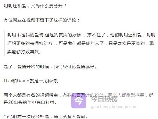 镜头里, Liza 和 David没有吵得面红耳赤,也没有互相指责,他们只是笑着、打趣着、哭着,把“我们分手吧”四个字说得轻飘飘又沉甸甸。