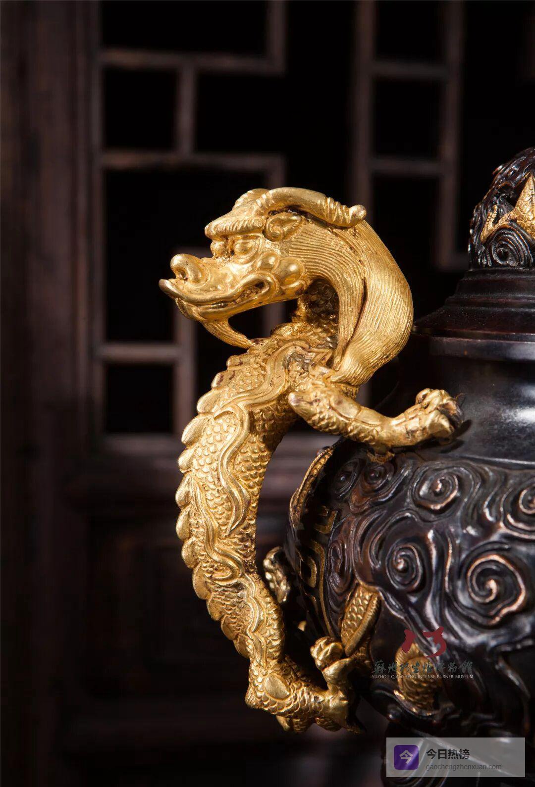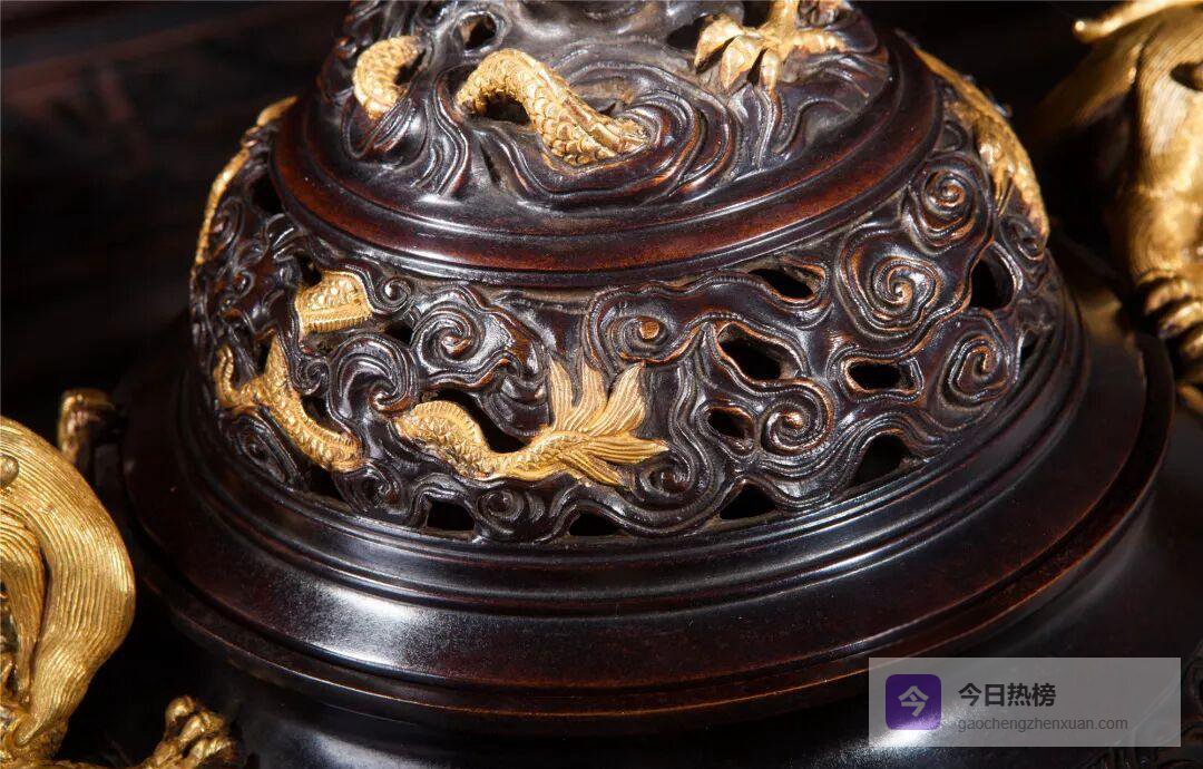 鎏金不是简单的镀金,而是把金液一点点“种”进铜纹里。带座万寿无疆熏炉周身祥云、双龙耳、龙钮抱珠,所有高起低洼处皆需先錾后烧,金汞合金才能依附得住。每一次点金,都像在铜面种下一粒金粉种子,随后以玛瑙棒推磨三百六十圈,金层与铜胎方能“咬”在一起。因手工推磨,每片云纹的边缘都留下细微的高低差,俯身细看,仿佛能捕捉到云与龙游走的呼吸。