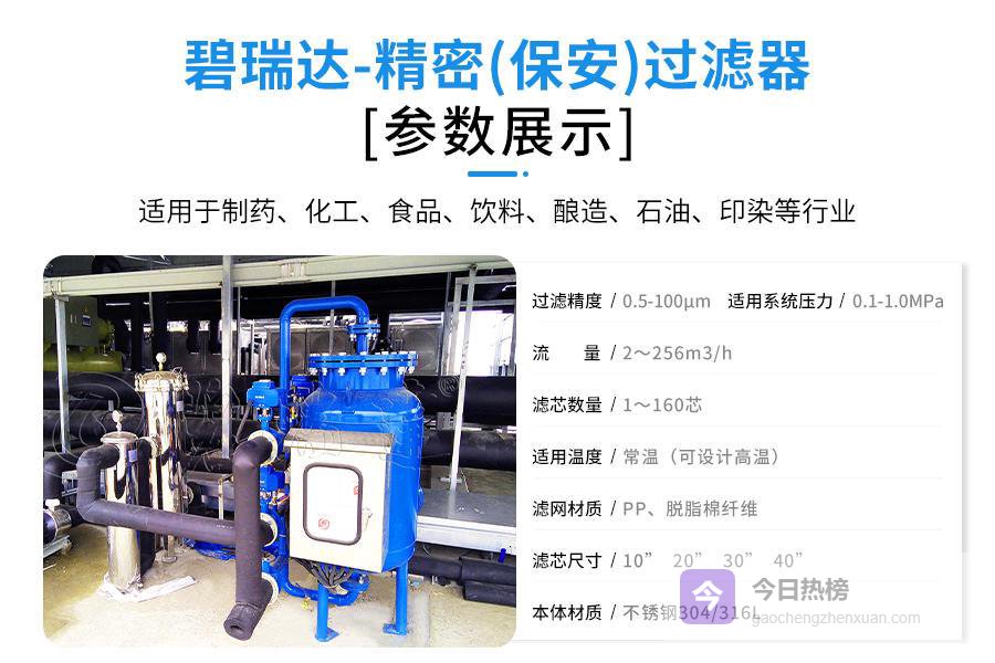 核心保护:精密(保安)过滤器作为终端屏障,直接保护敏感设备。提升稳定性:通过持续去除细微杂质,有助于主系统平稳运行。适应性强:可根据水质变化选择不同精度的精密(保安)过滤器滤芯。总而言之,在工业循环水处理领域,精密(保安)过滤器是一个简单却高效的风险管理工具。碧瑞达环保提供的这类产品,通过其合理的设计与可靠性能,为众多工业用户的流体净化环节增添了安全保障。明智地选用并维护好精密(保安)过滤器,可以为您的循环水系统构建起一道坚实的最后防线。