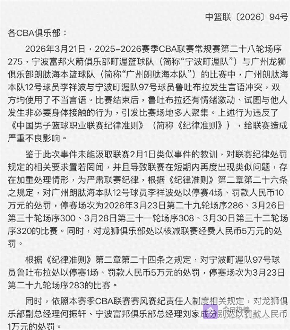 仅仅两天后,CBA公司于3月23日正式发布了处罚公告。 公告措辞严厉,详细列明了处罚依据和结果。 对李祥波的处罚依据是《中国男子篮球职业联赛纪律准则》第二章第二十六条。 CBA官方认定,李祥波使用了带有侮辱性的不当言论,影响恶劣。 最终处罚是停赛4场,并罚款人民币10万元。 这4场停赛将包括接下来对阵浙江、上海、江苏和深圳的比赛。