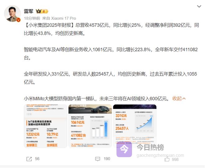 在汽车行业整体“增产不增利”、利润率跌至4.1%历史低位的背景下,小米交出了一份令市场侧目的成绩单,其智能电动汽车及AI等创新业务全年收入1061亿元,同比增长223.8%,增速远高于手机、智能家电等传统业务板块,成为集团最强增长点,且该板块首次实现年度经营收益转正达9亿元,去年整体毛利率24.3%,同比提升5.8个百分点。