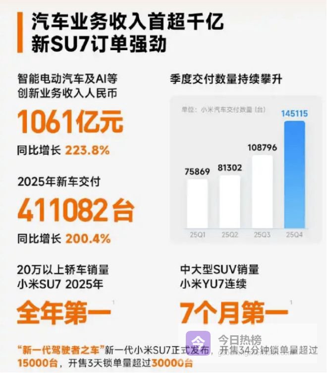 财报显示,2025年小米汽车季度交付数量持续攀升,其一季度交付75869台,二季度81302台,三季度108796台,四季度达到145115台。全年41.1万台的交付量,使小米稳居中国新势力车企第一阵营。