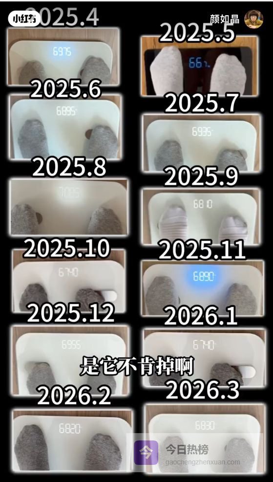然而近一年的体重变化却令她崩溃:从2025年4月的69.75公斤,到2026年3月的68.3公斤,一年仅减重1.45公斤(2.9斤)。