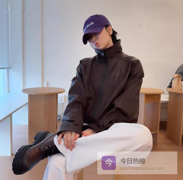 紧接着,她又分享了另一套造型。 这次她换上了棕色的皮夹克,内搭白色宽松长裤和同色系的棕色皮鞋。 头上戴了一顶紫色的棒球帽,风格瞬间转向休闲舒适,还带着几分中性的洒脱。 她坐在一张椅子上,翘着腿,侧着脸对着镜头嘟嘴拍照,表情里透出几分难得的俏皮感。