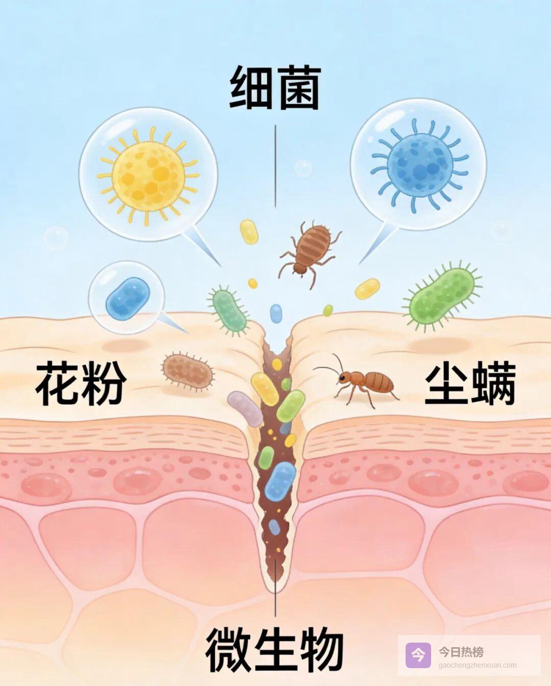 1.3 ▲ 刺激物:外援“打群架”花粉、尘螨、真菌大量滋生,顺着受损裂隙进入皮肤,免疫细胞误判“入侵”,于是刺痒、泛红、小疹子集体报到。
