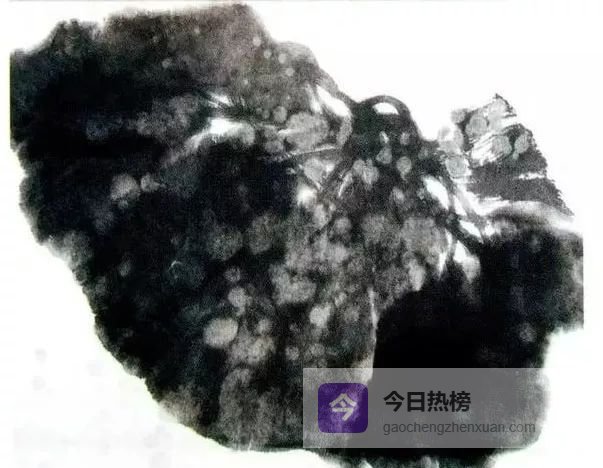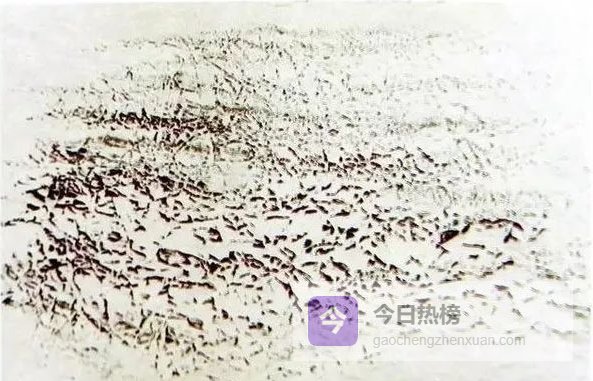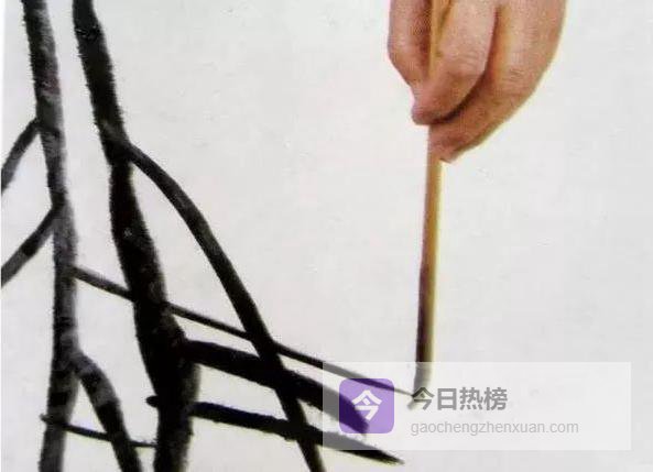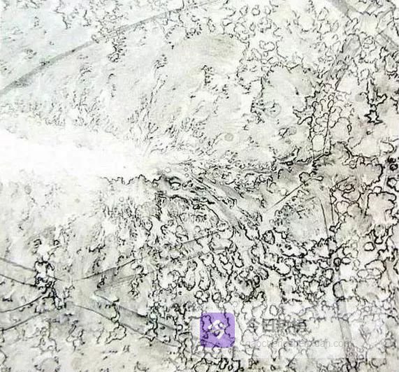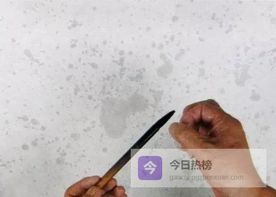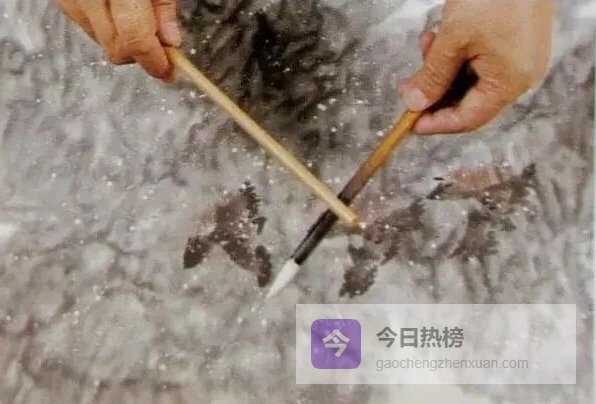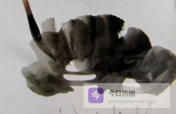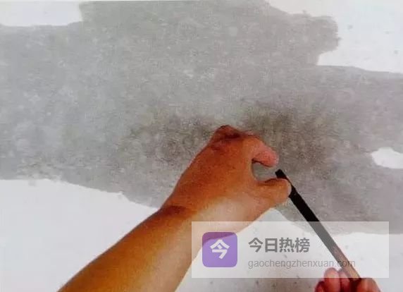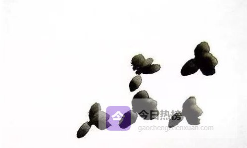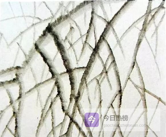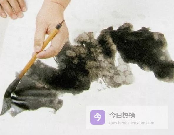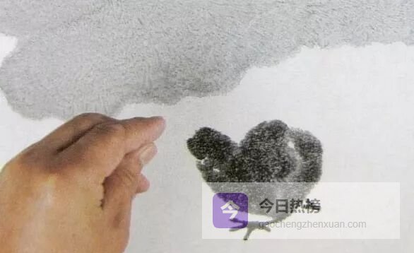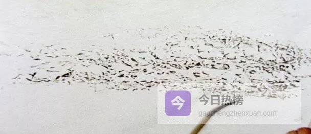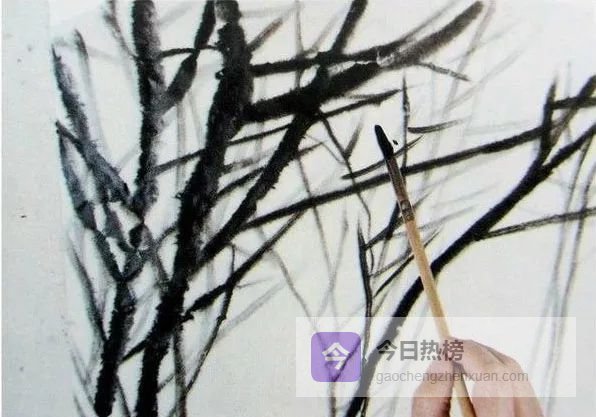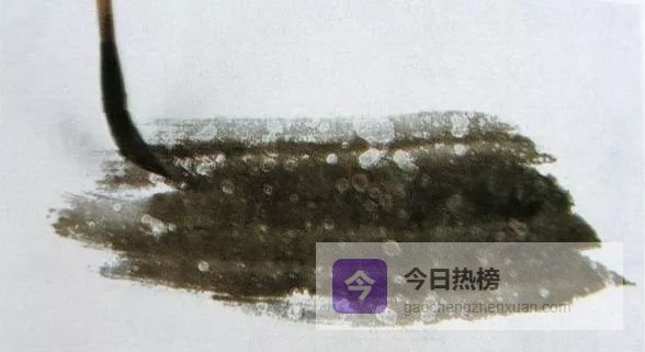 用干净笔蘸清水由外向内弹、点、洒,墨向两边渗开,中间留白,笔痕与水痕对比立刻出现;