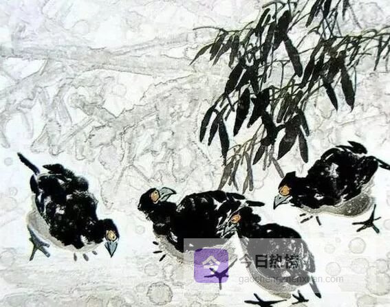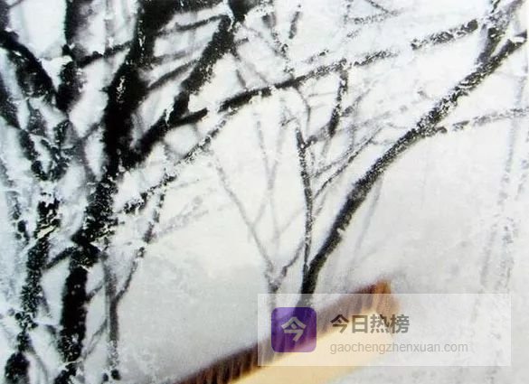 冬天背景最怕死板。调一份冰雪灰〔淡墨+清水〕大面积刷底,趁半干用盘子盛少许洗洁精+少量水,硬毫笔蘸后弹、甩、点于画面。几秒后,洗洁精破坏水膜,出现不规则亮斑,正是积雪开始融化的神态。干后若需补景,可再分层画花与鸟。