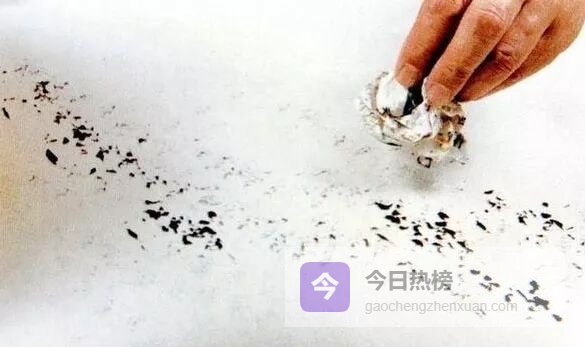 10. 纸团蘸墨法:把“地纹”踩出来 把牛皮纸团蘸足浓墨在盘中滚一圈再按压于宣纸之上;纸团含水量大、边缘自然晕开形成不规则苔点与草地纹理;趁半干再用另一团淡墨轻压增加层次;最后补鸟补枝让画面动静相生。