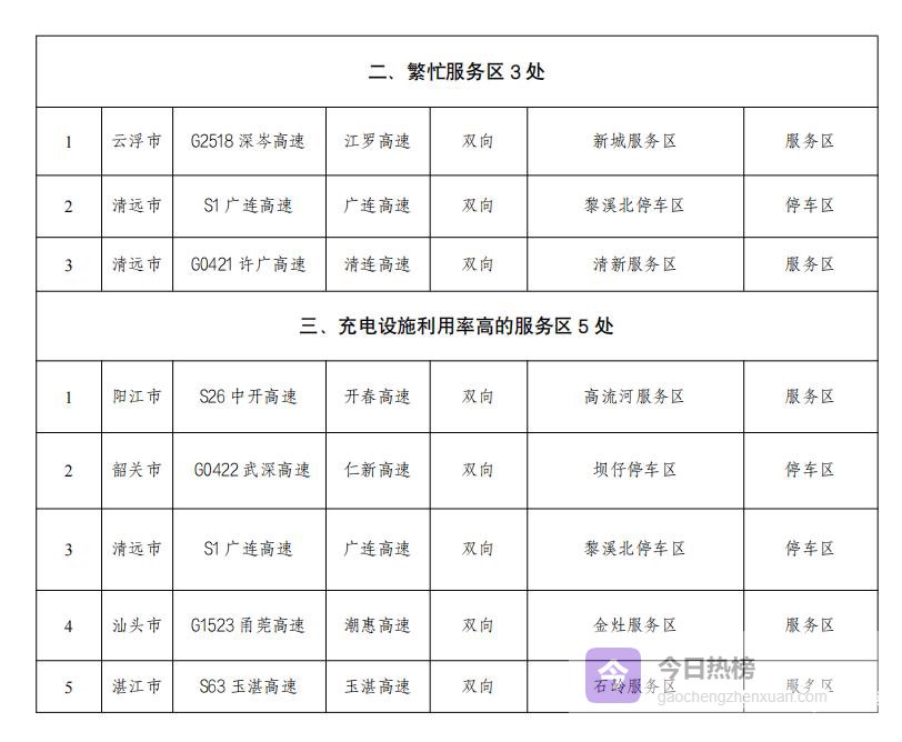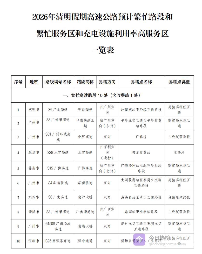 经过与广东省公安厅交管局的联合研判,广东省交通运输厅发布清明假期较为拥堵的路段、车流较饱和的服务区以及充电设施利用率高的服务区,供市民出行参考。