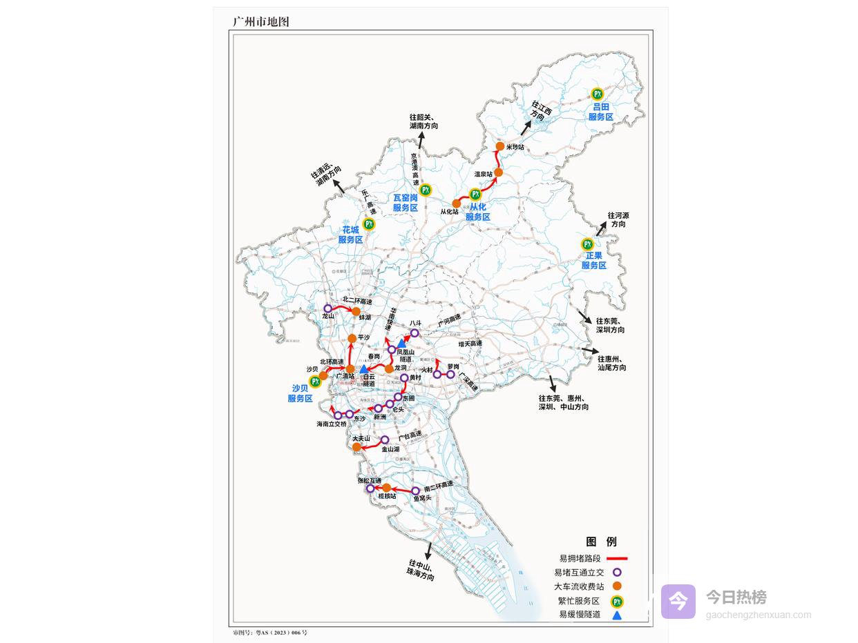 据预测,出城高峰集中在假期前一日(4月3日)16时至21时、假期首日(4月4日)10时至13时;返程高峰出现在假期最后一日(4月6日)13时至21时,其中17时左右为出行峰值。进出城高峰期间,短时车流聚集易出现局部缓行,易出现缓慢的路段主要集中在北环高速、北二环高速、广河高速、华南快速、广深高速、东南西环高速等高速的互通立交、隧道、路段合流瓶颈段,以及与市区主干道衔接处。