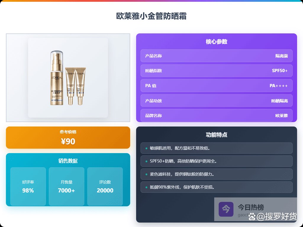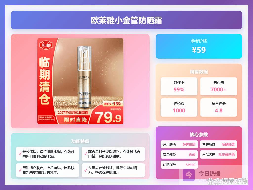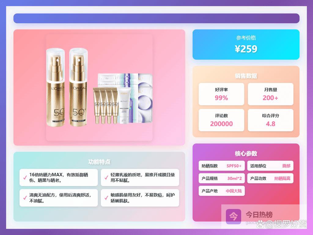 ① 高效防晒:这款防晒霜有SPF50+和PA++++,能有效防挡98%的紫外线,帮你抵御晒伤、晒黑还避免肌肤老化,基本不用担心阳光伤害。
