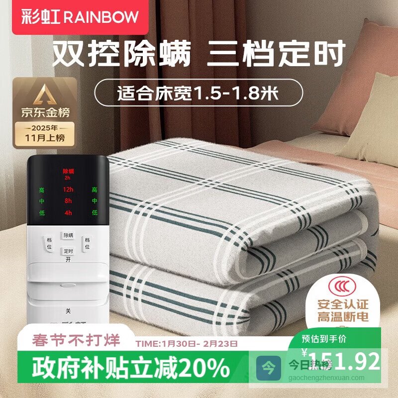 【京东自营】彩虹【高温断电】双人定时除螨双温双控无纺布电热毯电褥子1.8*1.5米¥
