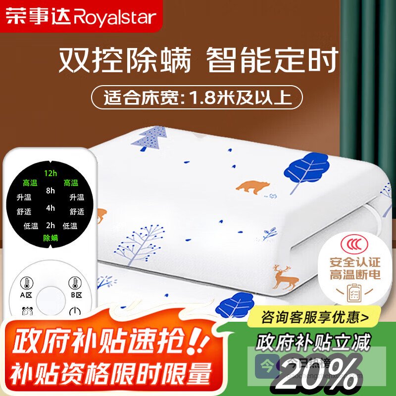 【京东自营】荣事达【高温断电】双人定时除螨双温双控无纺布电热毯电褥子2.0*1.8米¥