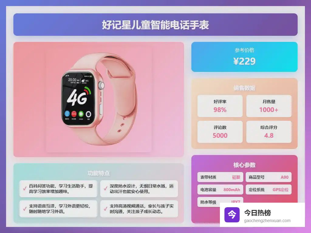 点评:这款好记星IND2智能手表真的挺实用的,支持4G全网通,不管是移动、联通还是电信的网络都能用,通话更顺畅,联网也更稳定。配备高清前置摄像头,可以进行高清视频通话,让家长可以随时看到孩子的动态,特别适合关注宝宝的安全和健康。手表还采用坚固耐用的防摔设计,即使不小心摔落,也不容易损坏,特别适合小朋友的日常使用。