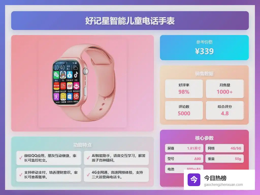 点评:这款好记星A90智能手表支持4G全网通,让你不用担心没有网络,随时随地打电话、发消息,超方便。它配备的是1.81英寸高清屏幕,画面清晰亮丽,看内容和视频都挺舒服,比普通手表好多了。