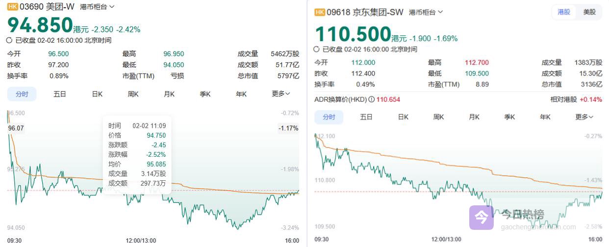 线下硬刚的代价,直接反映在股价上。2026年2月2日港股收盘,恒生科技指数大跌3.36%,京东集团股价跌1.69%,美团股价跌2.42%,近三个月两家股价均有下跌。投资者的担忧直击要害:线下扩张需要持续烧钱,刚刚亏损的美团、激进投入的京东,能扛住财务压力吗?