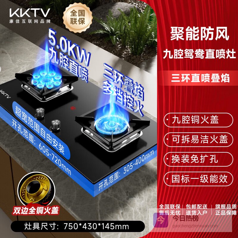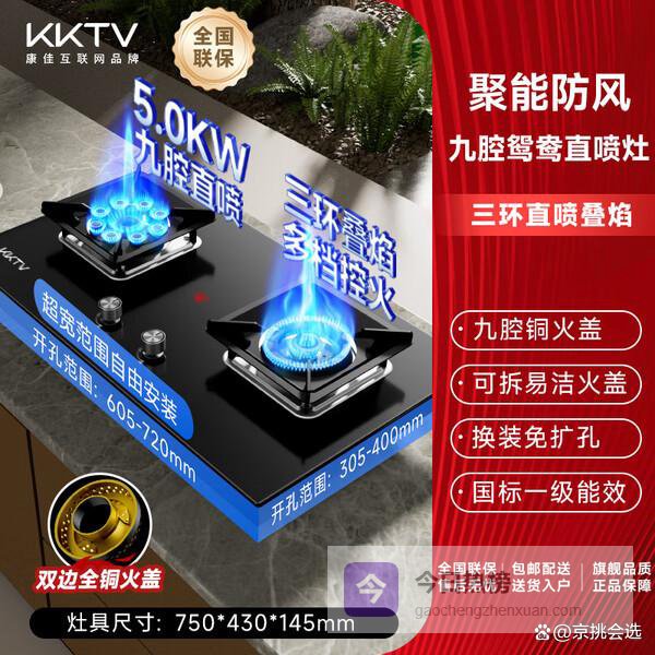 3、KKTV双灶具大火力这款灶具配备5.7kW超燃猛火,火力强劲,能够快速升温,特别适合需要大火爆炒的菜肴。一键爆炒功能让火力瞬间提升,满足烹饪过程中对火力的快速调节需求。而三环直喷燃烧技术和鸳鸯三环叠焰设计,确保火焰均匀覆盖锅底,热量集中,烹饪更高效。聚能猛火技术还能进一步提升燃烧效率,节能省气。
