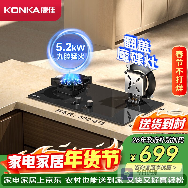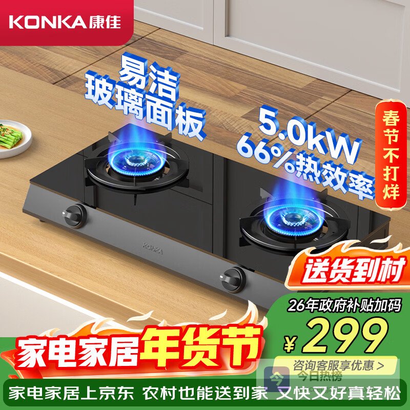 康佳(KONKA)燃气灶煤气灶双灶家用 5.2kW大火力匀火魔碟灶可翻盖清洁 九腔铜火盖JZT-KEH09(天然气)¥