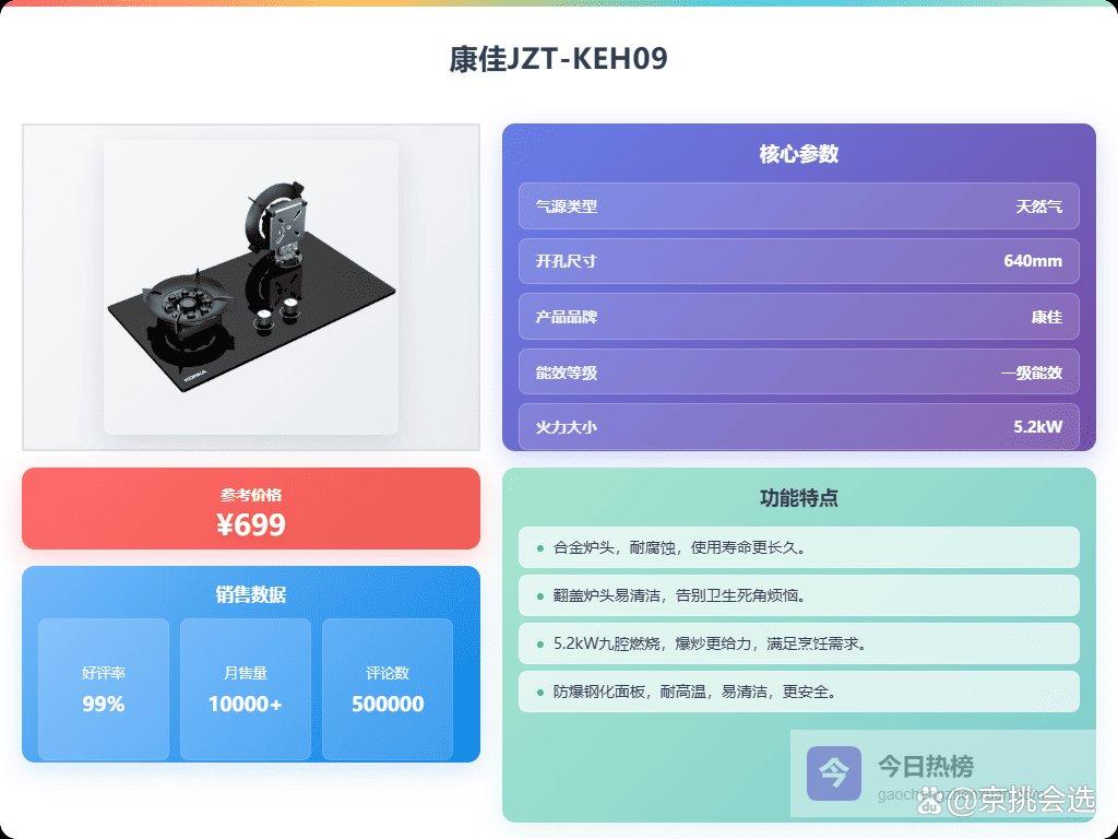 写在最后: 燃气灶的选择确实是个让人纠结的问题,康佳和樱花各有千秋,想要做决定还真得好好琢磨琢磨。康佳就像一位务实的朋友,告诉你性价比才是王道,同样的火力,更实惠的价格,让你轻松拥有。适合预算有限,又不想在烹饪体验上打折扣的朋友们,尤其是对爆炒有需求的家庭,康佳是个不错的选择,毕竟它在火力上也不含糊,日常使用绝对够用。而樱花呢,则像一位追求品质生活的精致达人,告诉你安全和细节才是关键,在品牌认知度上更胜一筹,更注重安全性能和细节设计,熄火保护、童锁功能等安全配置让你用起来更安心,适合对品质有更高要求,愿意为安全和舒适体验买单的朋友。总而言之,选择燃气灶就像选伴侣,没有绝对的好与坏,只有适不适合。结合你的预算、对火力、安全、易清洁程度的需求,再看看上面提供的热门型号测评,相信你一定能找到最适合你厨房的那一位“灶”神,让你的烹饪生活更加得心应手!